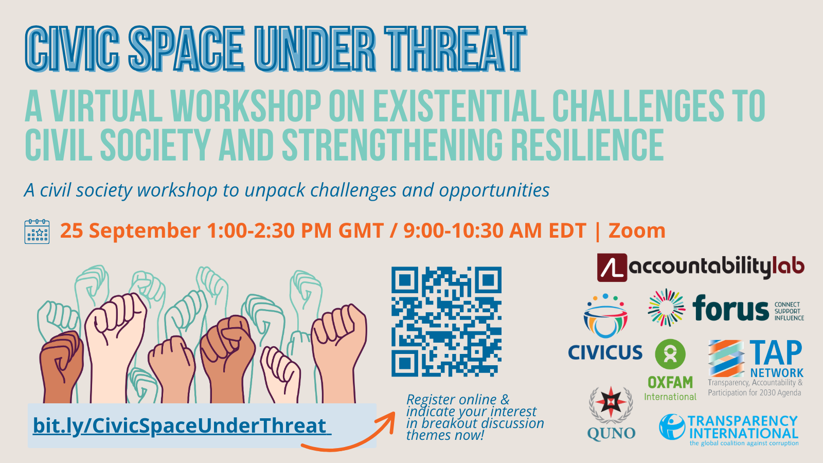 September 2025 marked the opening of the 80th session of the United Nations General Assembly (UNGA) and highlights the final stretch to achieve the 2030 Agenda. As world leaders convened in New York, QUNO NY joined the Accountability Lab, CIVICUS, the Ford Foundation, Forus, and the Transparency, Accountability & Participation (TAP) Network to co-host “Civic Space Under Threat: An Interactive Workshop on Existential Challenges to Civil Society and Strengthening Resilience” virtually on 25 September. The interactive event, which featured thematic breakout group discussions, focused on how civil society organizations (CSOs) can collaborate, emphasized solidarity-driven solutions and explored opportunities for renewed commitments to protect and resource civic actors. Participants discussed advocacy calls and strategies to call on Heads of State and Government aligned with the opening of the UNGA to bring substantive commitments to reversing trends of restriction and repression on civic space and supporting multilateralism through robust civil societies worldwide.